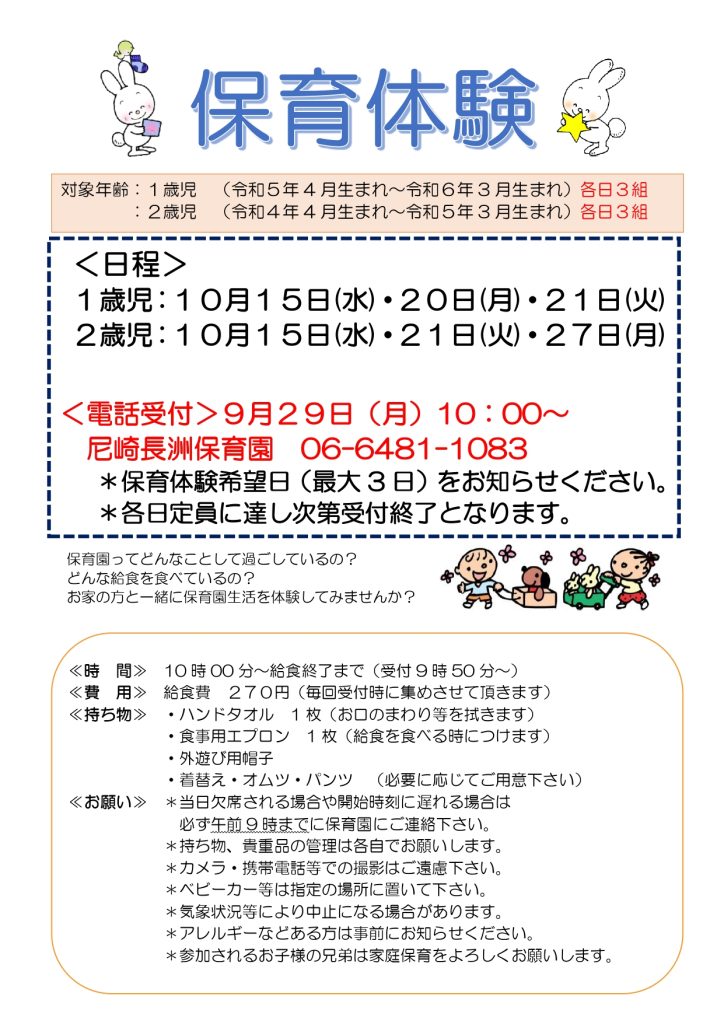 2025.09.24 保育体験のお知らせ 昨年と同様、3日間すべての参加だけでなく1日だけの参加も お受けいたします。 体験希望の日・クラス(1歳児か2歳児か)を申し込みの際に お知らせください。ご参加をお待ちしております。