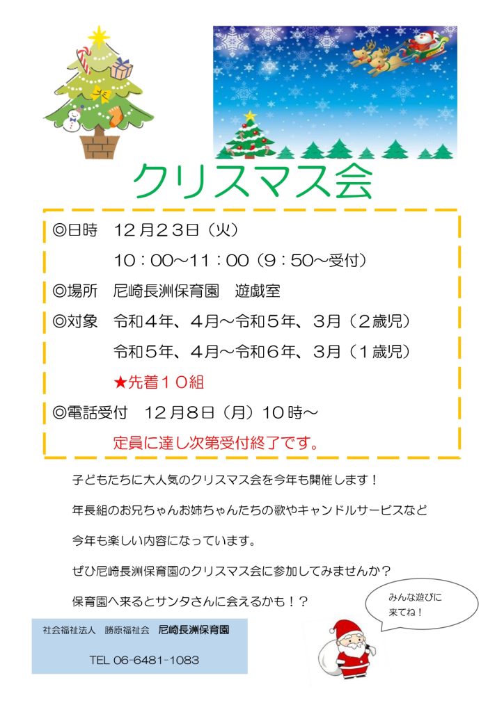 2025.12.03 クリスマス会のお知らせ 保育園のクリスマス会が12月23日(火)10:00~遊戯室であります! (当日の受付が9:50~です。) 申し込みは12月8日(月)10:00~です。 先着10組となりますのでお早めにお申し込みください!